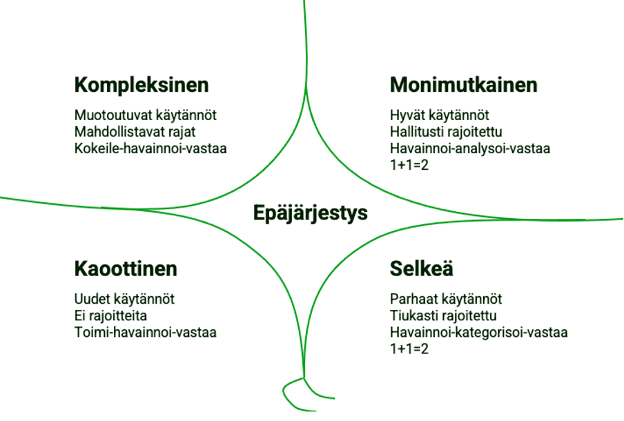 Onneksi on olemassa työkalu, joka voi auttaa meitä hahmottamaan kompleksisuutta ja ohjaamaan toimintaamme sen mukaisesti. Työkalun nimi on Cynefin-malli ja sen on kehittänyt Dave Snowden.